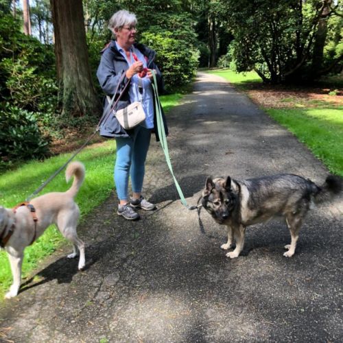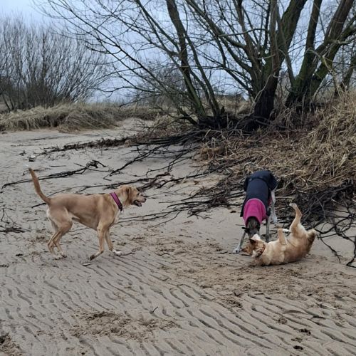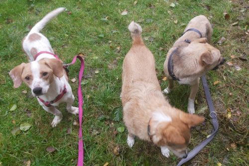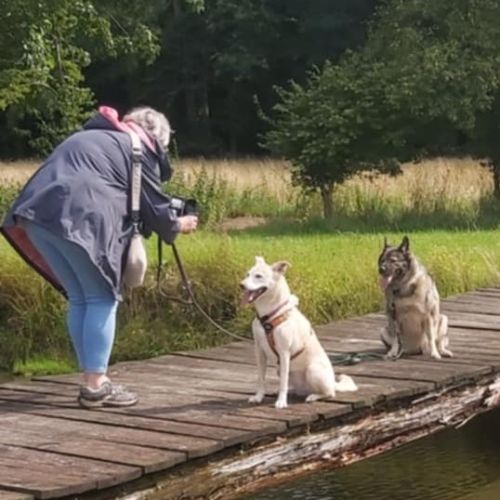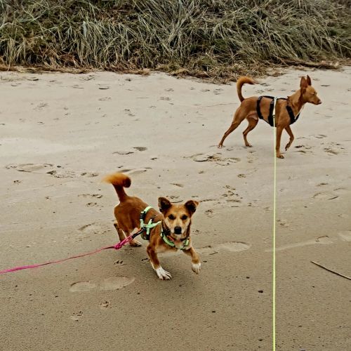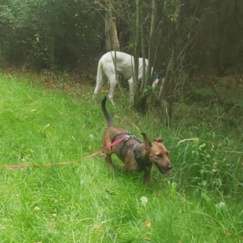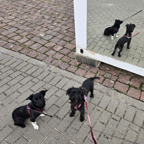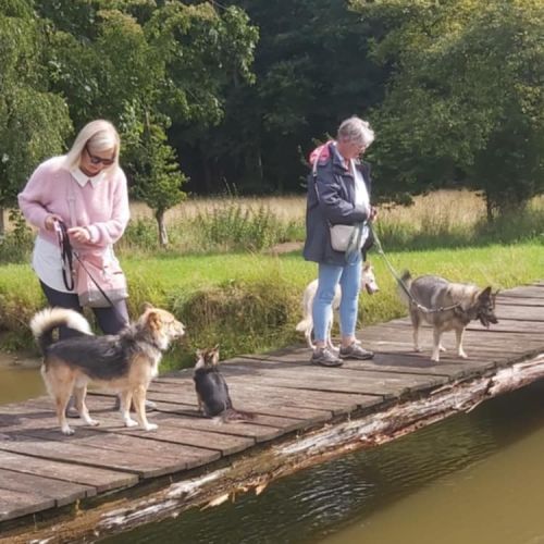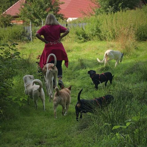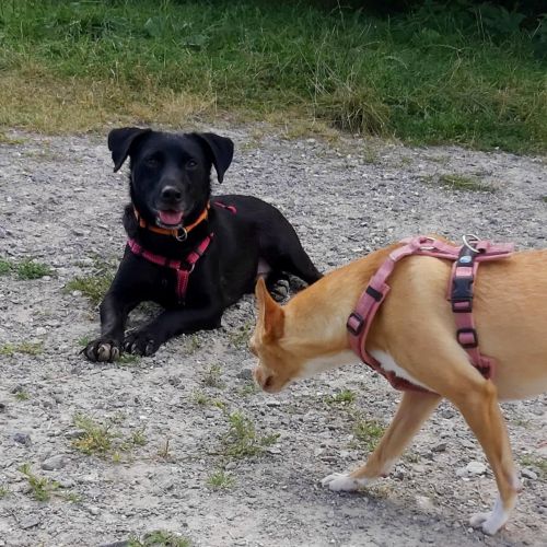 Aldona ist unterwegs eine sehr angenehme, zuverlässige Begleiterin, die gerne spaziert und interessiert alle kleinen Unterwegsabenteuer besteht. Aldona geht prima an der Leine und gibt sich tüchtig Mühe nicht zu zerren, dass gelingt ihr schon ganz hervorragend. Aldona läuft ebenfalls sicher an der Schleppleine und kann in sicheren Gebieten bereits frei laufen. Aldonas Radius ist gering, sie hält sich in der Nähe und passt gut auf, dass sie bei ihren Menschen bleibt. Aldona zeigt keinen Jagdtrieb.