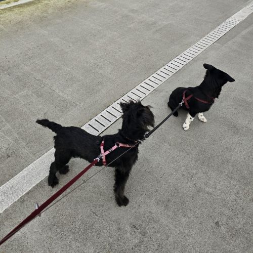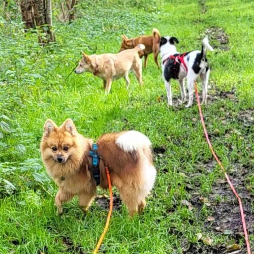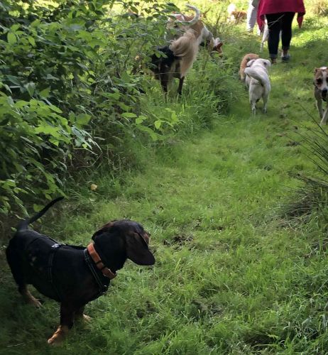 Unterwegs ist Alex mit seinen kleinen Stampfern erstaunlich wacker und engagiert unterwegs. Er trabt an der Schleppleine munter los und kann sich für Wald- und Feldwegtouren begeistern. Hundebegegnungen gestalten sich unaufgeregt.