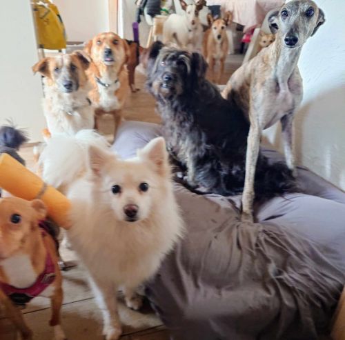 Wilma teilt ihre Pflegestelle mit vielen weiteren Hunden und kommt in der bunten Truppe prima zurecht. Die kleine Tante kann sich prima behaupten, wenn die jungen Wilden es einmal übertreiben, und wird wegen ihrer großen Sozialkompetenz und Freundlichkeit von all ihren kleinen und großen Mitbewohnern sehr geschätzt. Wilma verfügt über eine klare Körpersprache und kann ihrerseits ihre Artgenossen zuverlässig lesen. Wilma ist derzeit die Kleinste und Zerbrechlichste im Bunde, was sie nicht davon abhält auch mit den ganz großen Hunden zu spielen, wenn sie einmal der Hafer sticht.