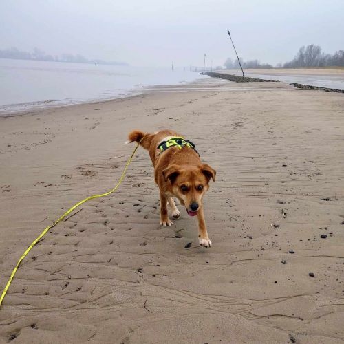 Aldona ist unterwegs eine sehr angenehme, zuverlässige Begleiterin, die gerne spaziert und interessiert alle kleinen Unterwegsabenteuer besteht. Aldona geht prima an der Leine und gibt sich tüchtig Mühe nicht zu zerren, dass gelingt ihr schon ganz hervorragend. Aldona läuft ebenfalls sicher an der Schleppleine und kann in sicheren Gebieten bereits frei laufen. Aldonas Radius ist gering, sie hält sich in der Nähe und passt gut auf, dass sie bei ihren Menschen bleibt. Aldona zeigt keinen Jagdtrieb.